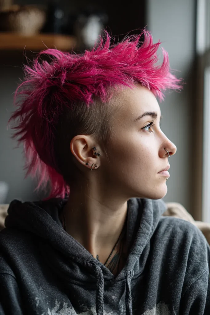 This daring look features a classic punk silhouette with a modern neon twist. The sides are buzzed close to the scalp to create a sharp contrast against the explosion of color on top. Short choppy layers provide an incredible amount of texture and height, which gives the hair a spiked, messy feel. The vibrant fuchsia pink hue is the real star here as it runs from the roots to the jagged tips. It is a medium-length style that manages to look both soft and edgy, thanks to the feathered ends that catch the light beautifully.