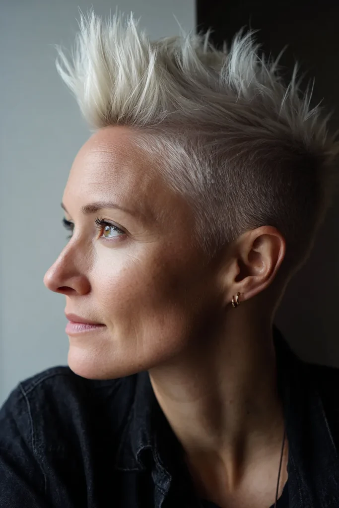 This look is the definition of sharp and sophisticated with a serious punk edge. The hair is cropped super short on the sides and back while leaving plenty of length through the top to create those dramatic icy spikes. It has a fantastic piecey texture that makes the silver platinum color really pop against the darker natural roots. The height of the spikes gives the whole style a lot of vertical energy and a windswept feel that looks intentional and polished at the same time.