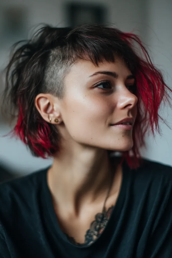 This edgy look features a chin-length bob with a daring buzzed undercut on one side for maximum contrast. The dark natural roots transition into vibrant magenta and fire engine red tips that really pop against the choppy texture. Short blunt bangs frame the face while the rest of the hair is styled in messy windswept layers to give it that effortless punk rock grit. It is all about that beautiful balance between a structured cut and chaotic color.