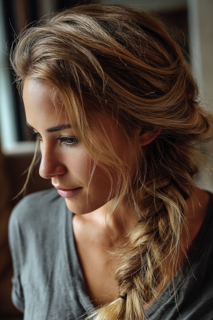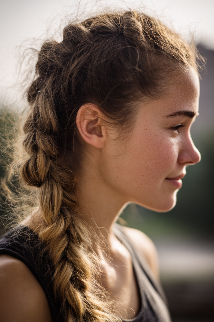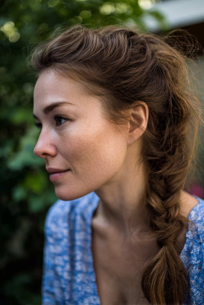 I am a huge fan of this look because it has that cozy intellectual vibe that works just as well at a coffee shop as it does on a hike. It is incredibly flattering because the volume at the top gives a little height while the loose tendrils soften your profile. No matter your plans for the day this braid stays secure while looking like you just happened to throw it together in five seconds. It really is the ultimate “cool girl” style for anyone who wants to look put together without losing that relaxed summer edge.