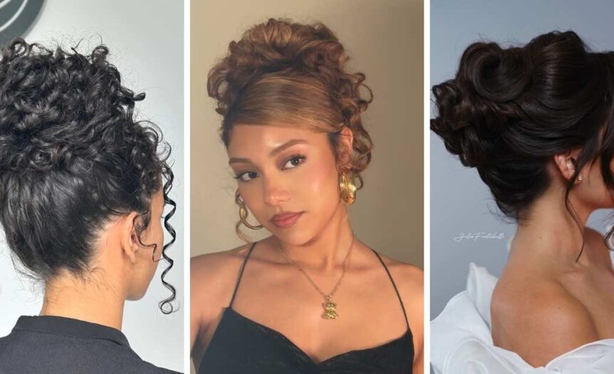 This curly updo is all about volume and movement, giving a dreamy and ethereal vibe. Great for weddings, proms, or any event where you want to shine, it’s best for naturally curly or permed hair.