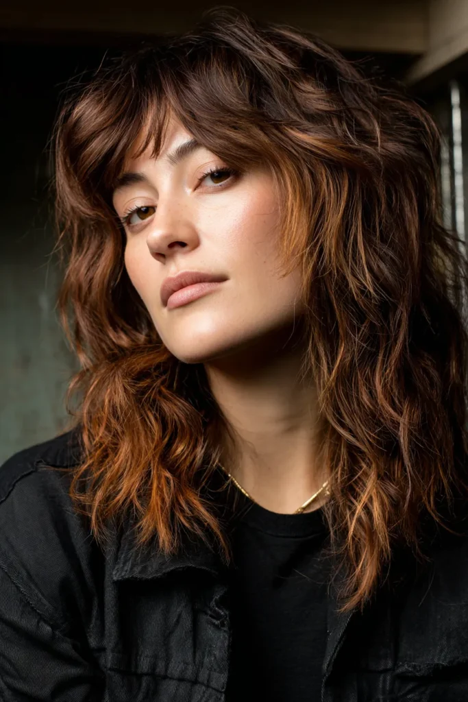 This shoulder-grazing wolf cut is the ultimate choice for anyone wanting to embrace their edgy side. The style is defined by its choppy layers and a thick curtain bang that blends seamlessly into the shaggy sides, creating a cool, lived-in texture. While the roots and crown stay a deep espresso brown, the mid-lengths and ends are treated to a gorgeous copper balayage. This pop of warm metallic color adds incredible depth to the messy waves, making the whole look feel intentional and high fashion.