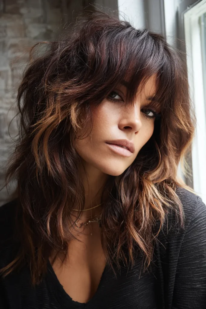 This gorgeous look features a mid-length cut packed with heavy, choppy layers and a full curtain fringe that beautifully frames the eyes. The rich, dark brown base is brought to life with warm caramel highlights concentrated heavily on the face-framing pieces and the ends. It is styled with a messy, piecey texture that gives off the ultimate rock star bedhead vibe.