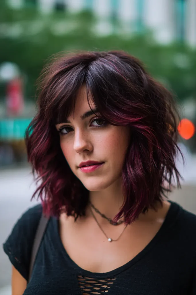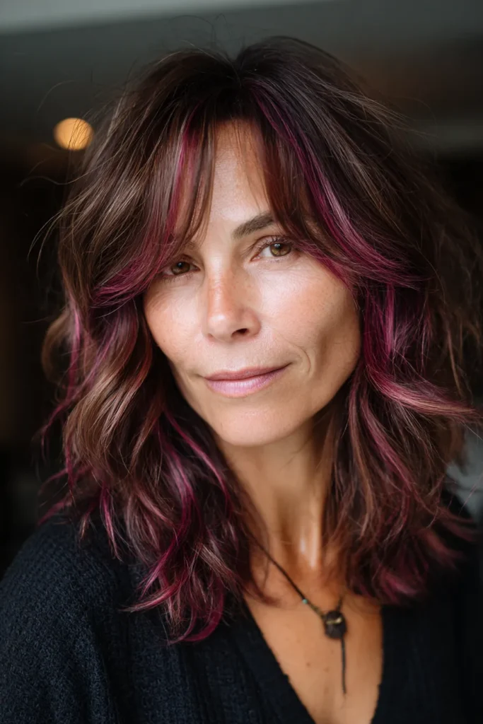 This medium-length style is all about that hidden “wow” factor. The cut features soft and tousled waves with face-framing layers and a light wispy fringe that hits just below the eyes for a relaxed feel. While the primary color is a gorgeous smoky brunette with subtle ash tones, it is the bold magenta highlights peekabooing through the mid-lengths and ends that really steal the show. These pops of vibrant pink and purple are strategically placed to catch the light as you move, giving the hair a sense of movement and a playful personality.
