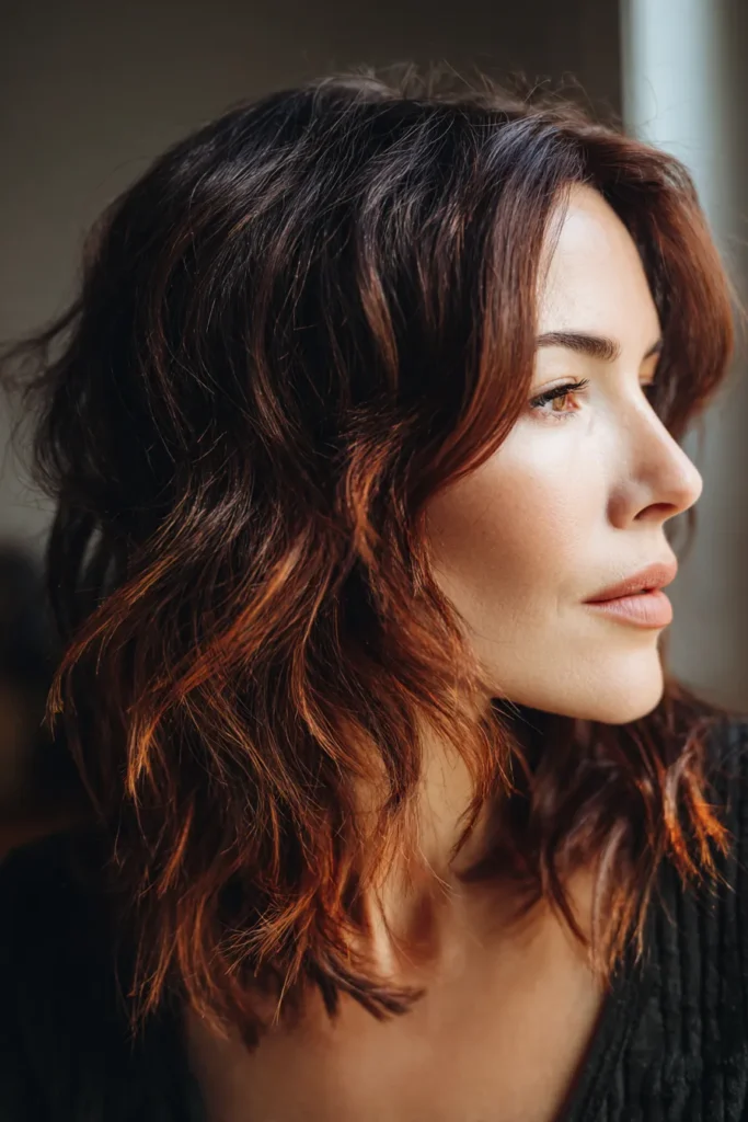 I’m really into this cut because it gives total cool-girl vibes. If you are looking for a way to add volume to finer hair, these short layers on top do all the heavy lifting for you. I love how the copper tones play against a darker base because it gives off such a cozy yet rebellious vibe that is perfect for any season. It is a total dream for those mornings when you just want to shake your hair out and go.