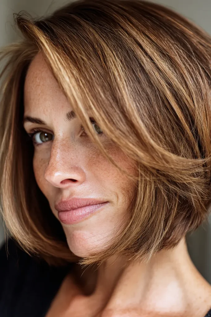 This style features a sharp, chin-length bob with a smooth, straight texture and a dramatic side part. The base is a soft medium brown that is elevated by fine golden blonde highlights running from root to tip. Subtle internal layers give it a gorgeous, rounded shape that hugs the jawline and creates effortless volume at the crown.