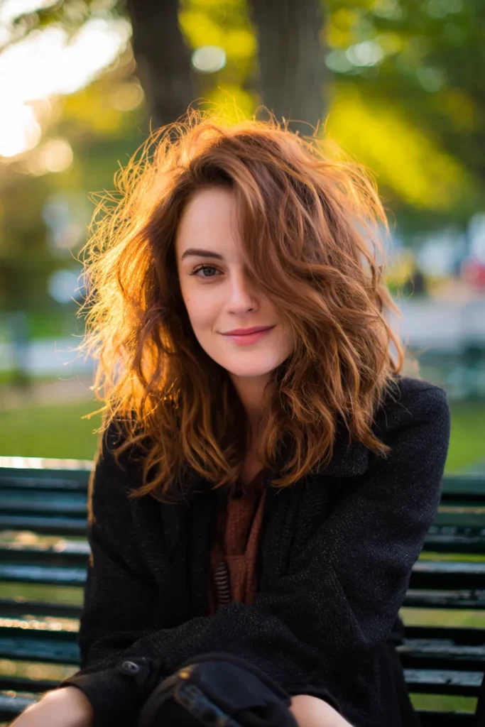 This playful shoulder-length cut radiates with a vibrant copper hue that looks absolutely magical in the golden hour light. The style incorporates heavy shaggy layers throughout the crown and mid-lengths to create maximum volume and a wilder textured feel. With a deep side sweep and undone messy waves, the hair possesses a spirited and adventurous personality that is far from your average basic bob.