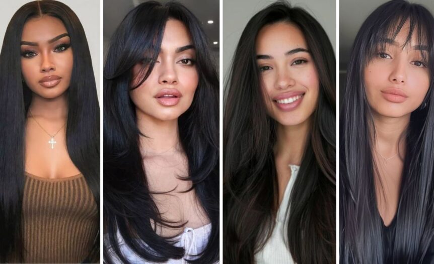 Long straight hair cascades smoothly, dense yet fluid in motion.